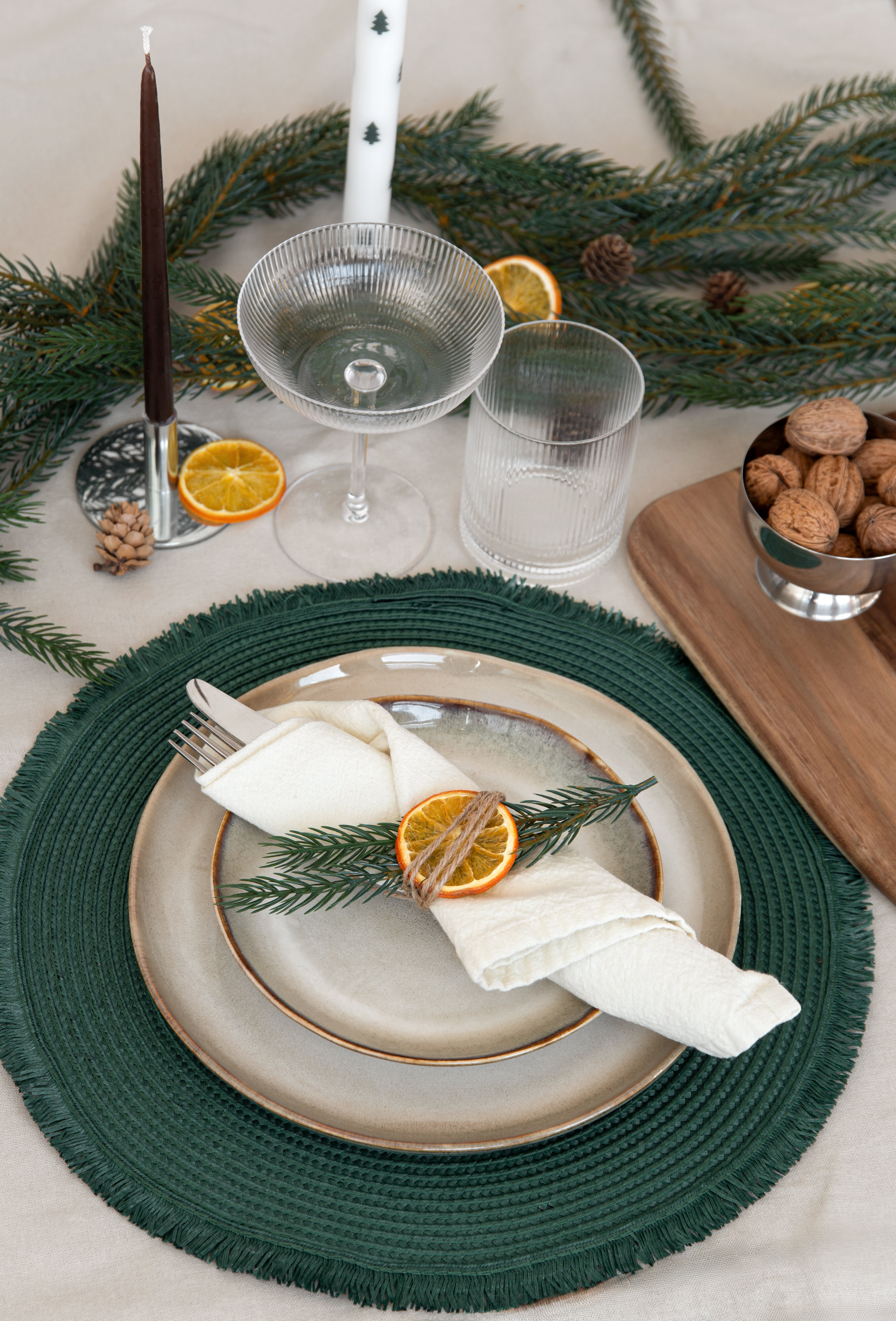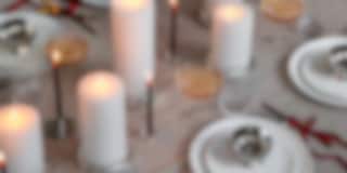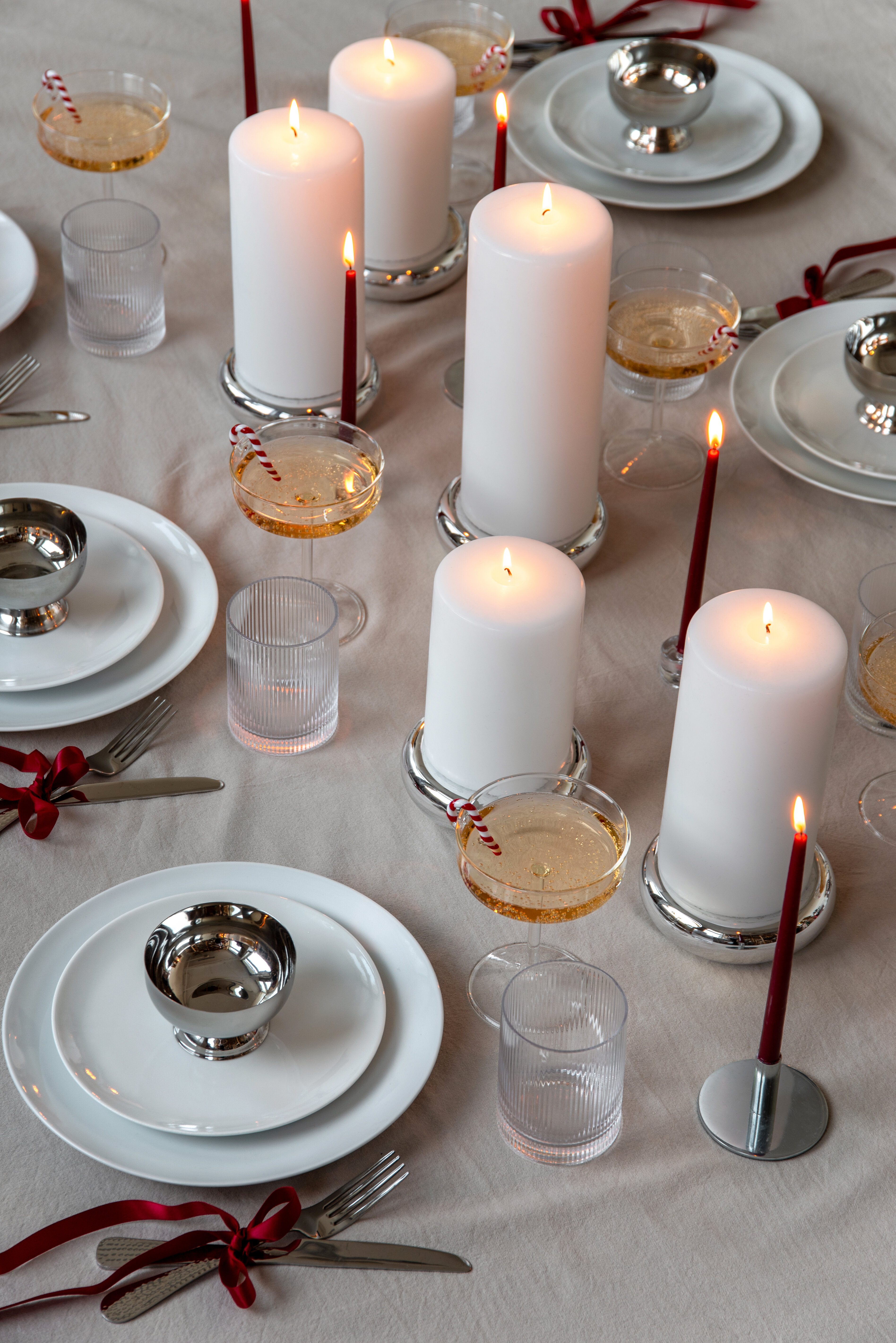 En elegant vinterdukning med höga vita blockljus, mörkröda antikljus och skimrande detaljer som skapar ett stilrent uttryck. Glasen, silverinslagen och de mjuka textilierna ger bordet en modern och festlig känsla. En perfekt kombination för både adventsmiddag och nyårsskål.
