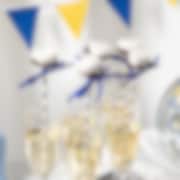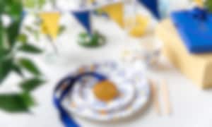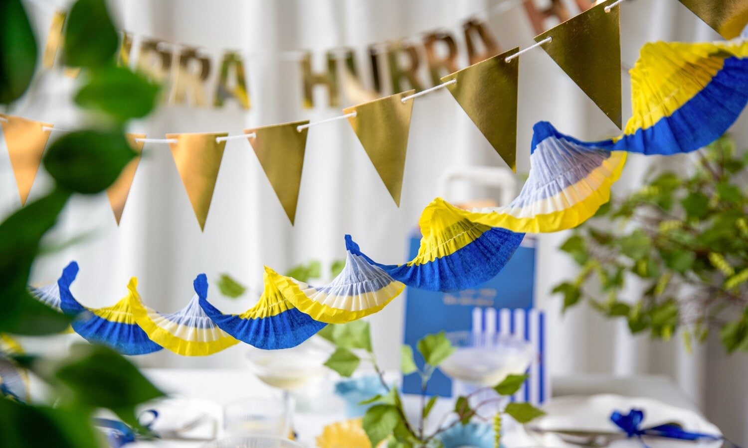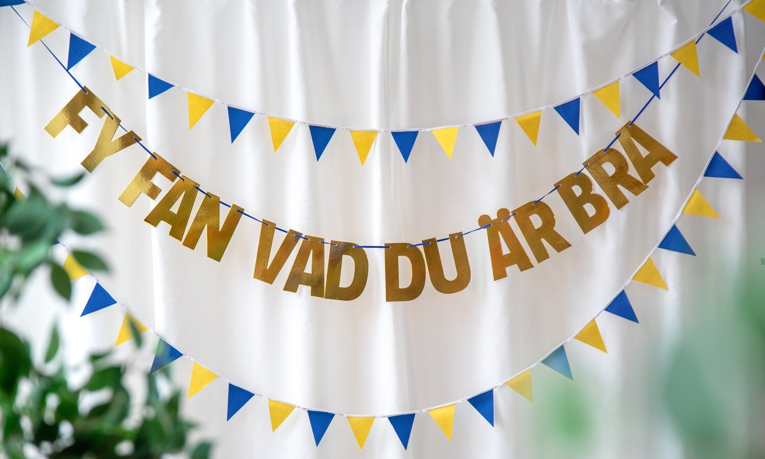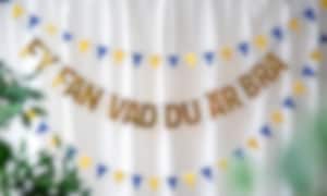 Blanda girlanger, vimplar och ballonger i blått och gult för en klassisk studentkänsla. Våga addera personliga budskap som sticker ut. En girlang med text som “Fy fan vad du är bra” ger både värme och glimten i ögat.