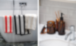 Börja med att byta ut badrummets textilier - byt ut badrumsmattan till en mjukare variant i höstliga toner och häng upp nya, fräscha handdukar. Komplettera med en ny tandborstmugg och tvålpump, gärna i mörkt färgat glas – ett stilrent och trendigt material som passar perfekt under höstens inredningstrender.