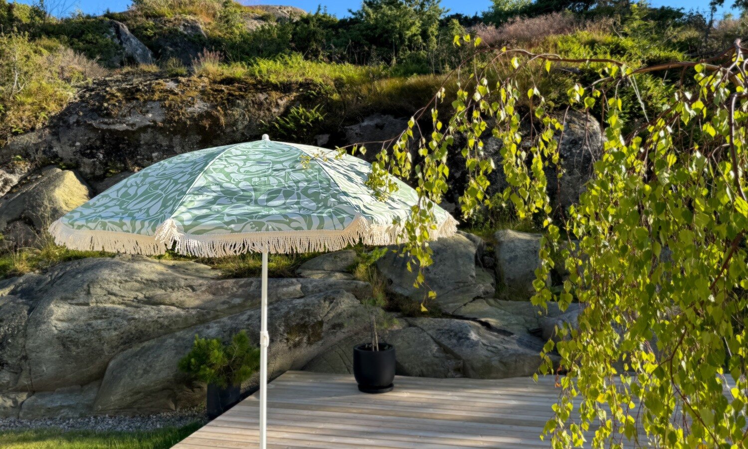 Det vanligaste är att man sätter upp parasoll. Men du kan också använda dig av tyger som skydd om du har något att hänga dem i. Det ger en annan sorts ombonad känsla och visst är det vackert att sitta och njuta under ett tyg som fladdrar lätt i vinden.