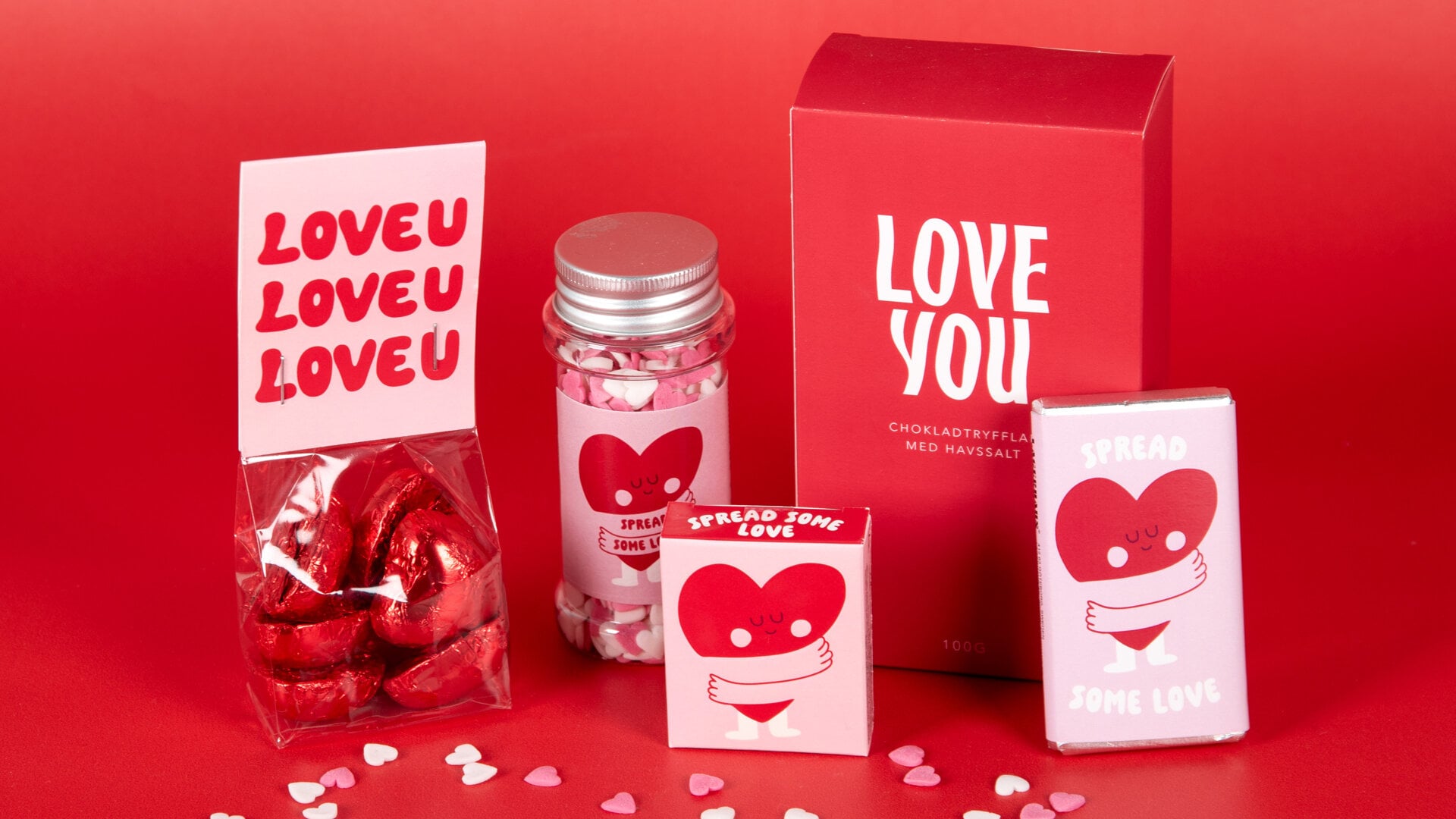 - Presentpåsar med budskap som Kärlek, Love U, Kram och Omtanken