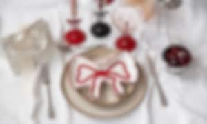 Skapa en trendig och lyxig dukning genom att kombinera hårt med mjukt – som kromade metaller och glansiga sidenband. Denna dukning blandar silver, rosetter och läppstiftsröda accenter med en neutral bas för en stilsäker och kontrastrik look.
