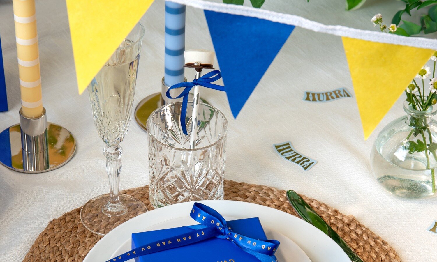 När det kommer till studentfest är detaljerna minst lika viktiga som maten. Små dekorationer i studentens färger blått och gult skapar helhet och ger festen det där lilla extra.