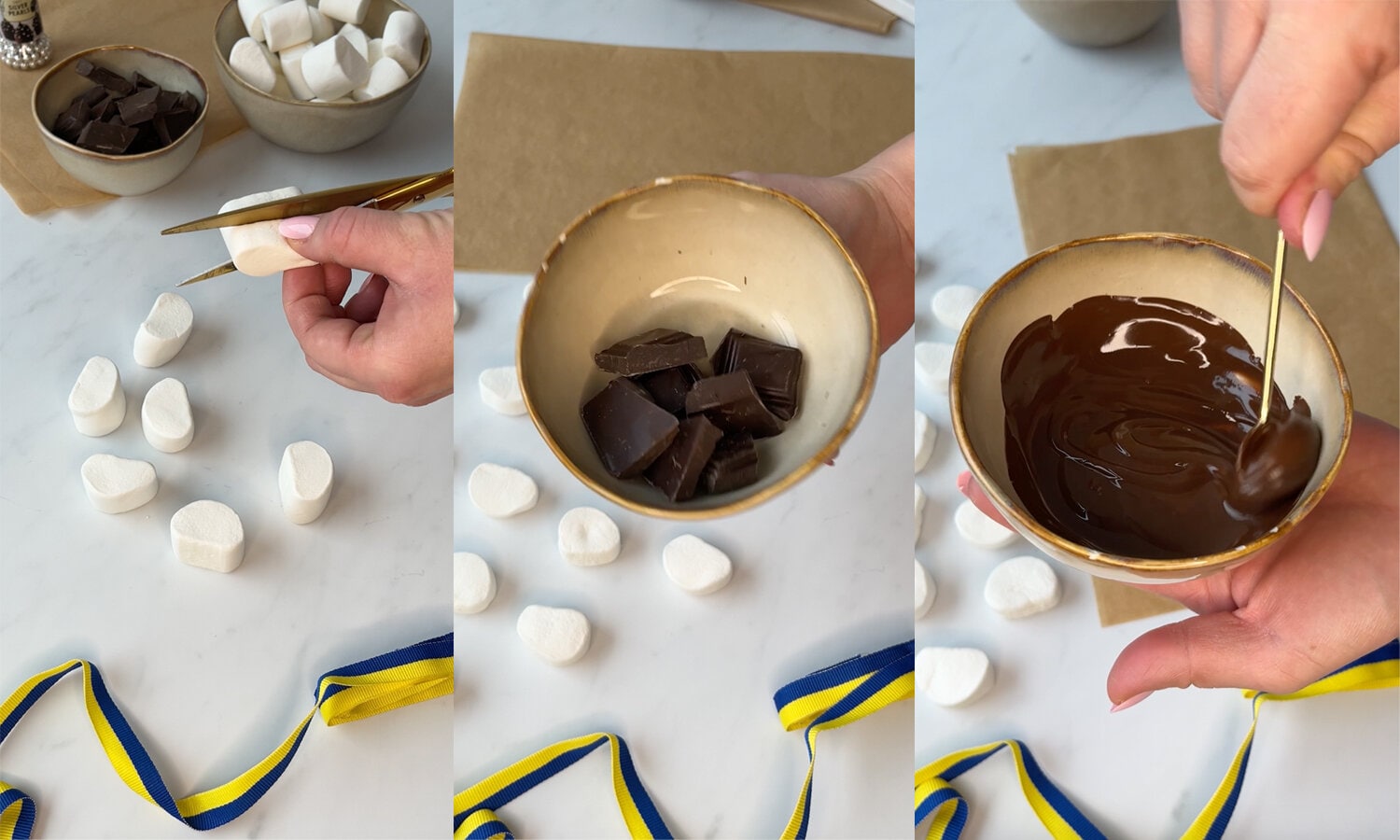 - Klipp marshmallows på hälften med en sax så att du får två jämna delar.