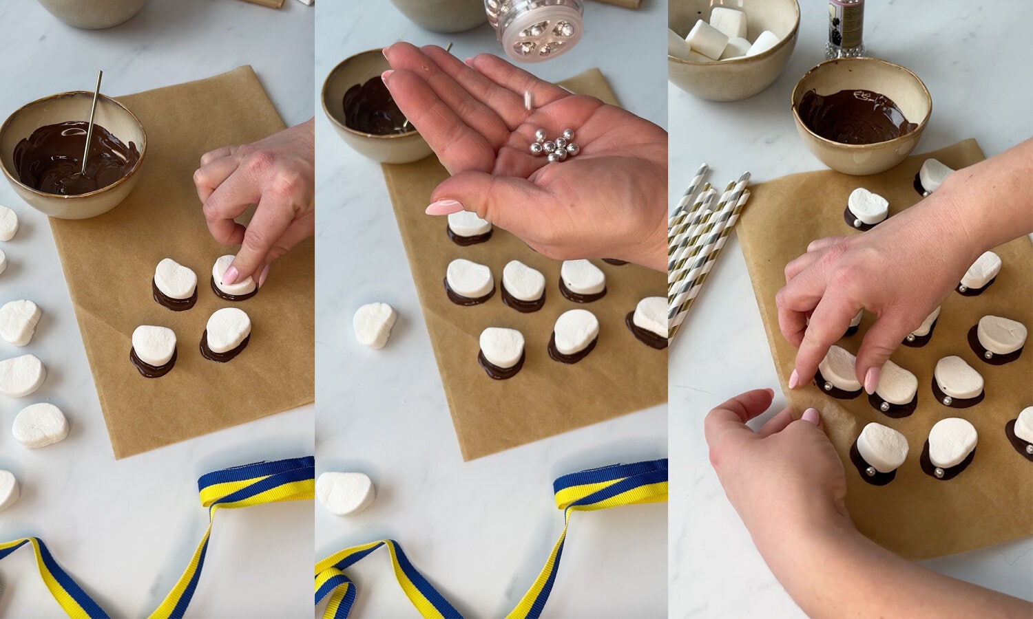 - Doppa den klippta sidan av marshmallowen i choklad. Tryck den lätt mot bakplåtspapper så att det bildas en liten ”skärm” framtill - precis som på en studentmössa.