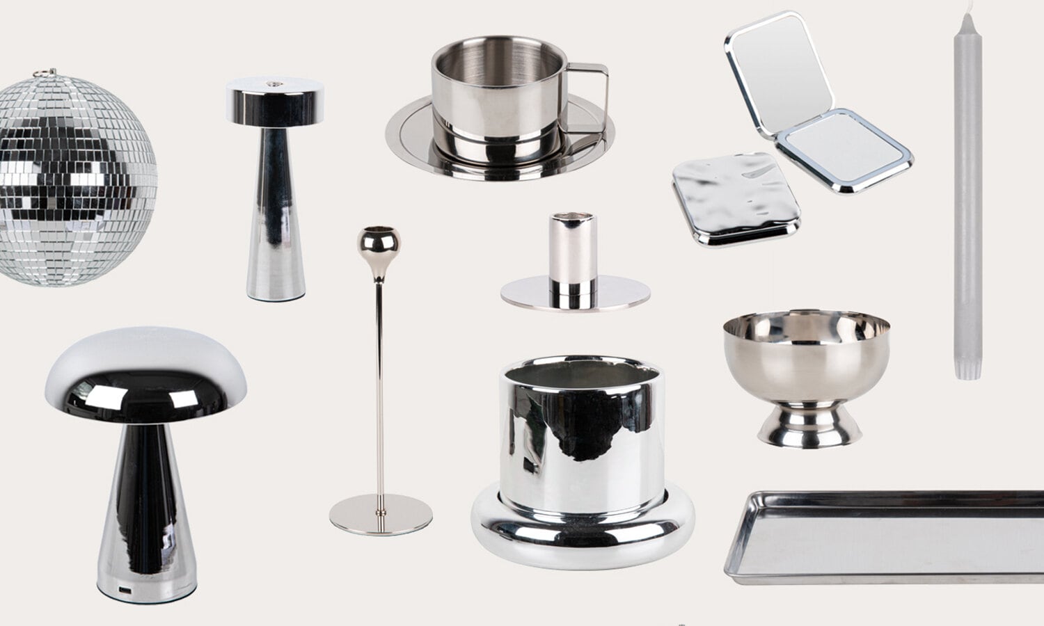 I kollaget syns allt från ljusstakar och kaffekopp i metall, till en spegel i kompakt format och dekorativa brickor. Här finns även statement-produkter som en bordslampa i silverlook och en klassisk discokula – detaljer som verkligen drar blickarna till sig.